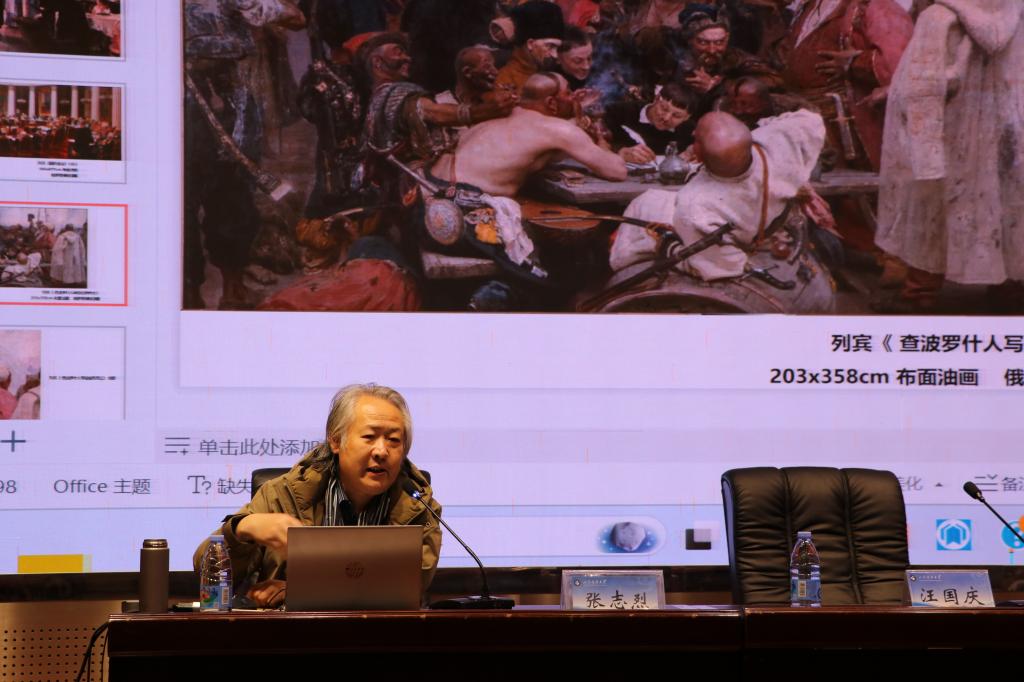 主讲人张志烈,青岛理工大学教师、青岛美术家协会美术教育委员会副主任兼秘书长。在讲座中,张老师首先对什么是艺术、什么是文化进行了阐释。他从俄罗斯的文化讲起,深入浅出地讲解了列宾的《国务会议》《伊凡雷帝杀子》等著名布面油画,让师生领略到了俄罗斯的艺术与其潜在文化的内涵。张老师通过介绍艺术和文化的定义和内涵,打破边界、搭建艺术与文化、生活交融的桥梁的重要性,让现场师生对艺术与文化有了清晰的认识与感受。