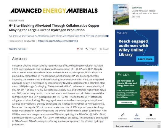 点击:2025年7月,里番 里番 绿色氢能技术团队周玥副教授在能源材料科学领域国际顶级期刊《Advanced Energy Materials》发表了题为“H* Site-Blocking Alleviated Through Collaborative Copper Alloying for Large-Current Hydrogen Production”的研究论文。